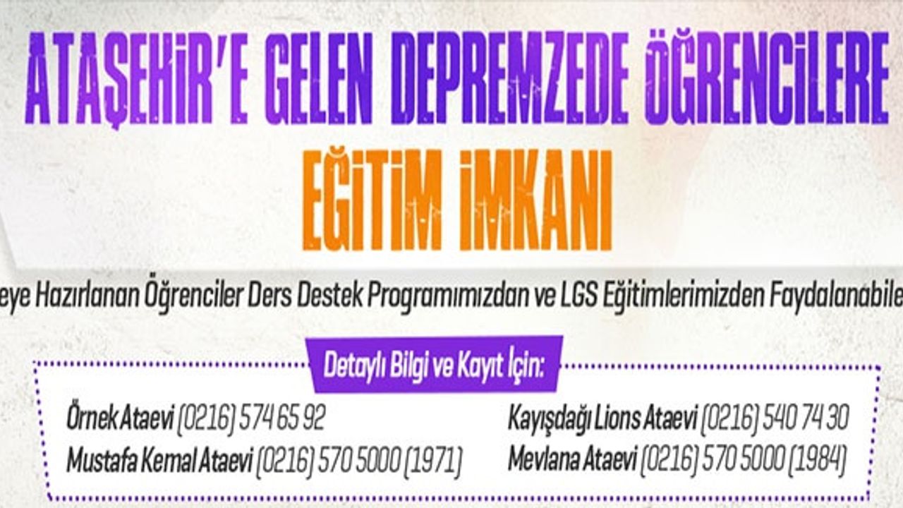 Bu kapsamda üniversite ve liseye hazırlanan öğrenciler Ataşehir Belediyesi’nin Ferhatpaşa Gençlik Merkezi, Neşet Ertaş Kültürevi ile Ataevleri’nde ders destek programlarından ve eğitimlerinden faydalanabilecek.
