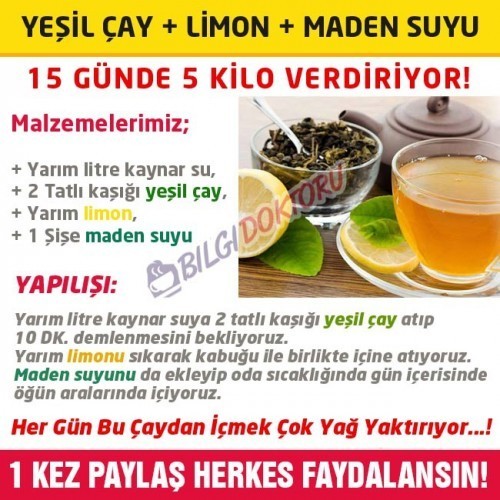 Yağ Yakan Zayıflatan Tilya Kürü Nasıl Yapılır – İbrahim Saraçoğlu Şimdi gelelim bu mükemmel zayıflatıcı yiyeceklerimiz ile yağ yakımını hızlandırıcı form çayının hazırlanışına; Malzemelerimiz; Yarım litre kaynar su, 2 Tatlı kaşığı yeşil çay, Yarım limon, 1 Şişe maden suyu Yeşil Çay + Maden Suyu + Limon ile Zayıflama Çayı Nasıl Yapılır? Yapılışı: Yarım litre kaynar suya 2 tatlı kaşığı yeşil çay atıp 10 dakika kadar demlenmesini bekliyoruz. Daha sonra yarım limonu sıkarak kabuğu ile birlikte demlenen yeşil çayın içine atıyoruz. Ardından maden suyunu da ekleyerek çayımızı hazır hale getiriyoruz. Sodalı, limonlu yeşil çayımızı oda sıcaklığında gün içerisinde öğün aralarında içiyoruz. Her gün düzenli olarak yukarıda tarifini verdiğimiz gibi sodalı limonlu yeşil çay içmek çok fazla yağ yaktırıyor, zayıflatıyor…