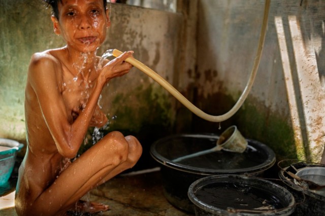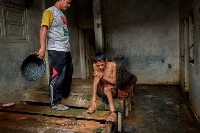 Seapudin’s (sağda) 9 yıldır engelli. Bacakları hareketsiz kalan hastanın kemikleri iyice zayıflamış.