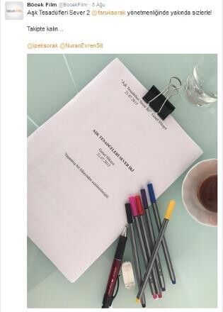 Devam filmi için hazırlıkların başladığı müjdesi, Böcek Yapım’ın sosyal medya hesabından paylaşılan “Aşk Tesadüfleri Sever 2 Faruk Sorak yönetmenliğinde yakında sizlerle! Takipte kalın…” notuyla verildi. Filmin tamamlanmış senaryosunun fotoğrafı da paylaşıldı.