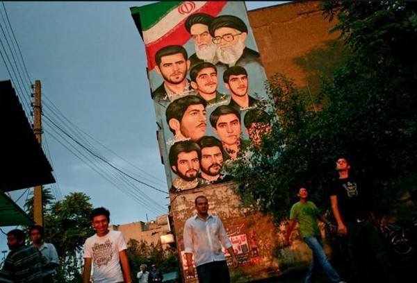 Tahran’da bir sokak. Afişte en üstte İran İslam Devrimi'nin siyasi, hukuki ve ruhani önderi Ruhullah Musavi Humeyni, Altında da İran İslam Cumhuriyeti'nin dini lideri Ayetullah Ali Hamaneyi var. İran-Irak savaşında şehit olan askerler de devamında anılıyor.