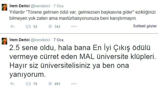İrem Derici '2.5 sene oldu, hâlâ bana En İyi Çıkış Ödülü vermeye cürret eden mal üniversite klüpleri... Hayır, siz üniversitelisiniz ya, ben ona yanıyorum. 'Törene gelirsen ödül var' ezikliğinizi bilmeyen yok ama mastürbasyonunuza beni karıştırmayın” tweet'i attı.