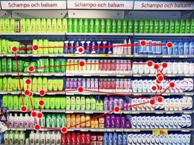 Bu örnekte ise müşterilerin şampuan reyonuna sağ üst köşeden bakmaya başladığını, ardından aşağı raflara ilerlediği görülüyor.