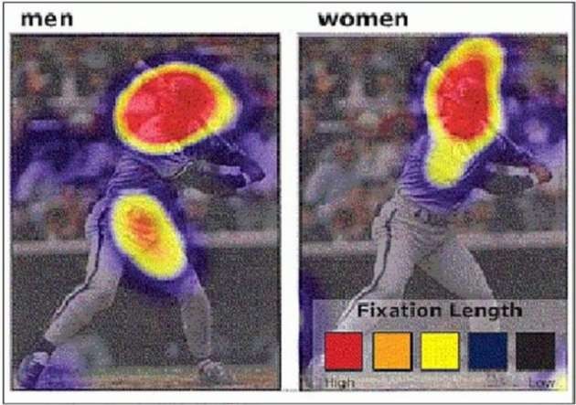 Beyzbol maçı izleyen erkeklerle kadınların ilgisi çok farklı. Solda erkeklerin sağda ise kadınların vuruş yapılırken odaklandıkları bölgeler görülüyor.