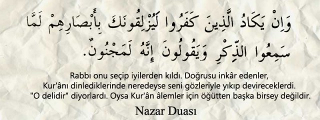 İyi ya da kötü hiç kimsenin aşamadığı Allâh'ın tam kelimeleriyle Allâh'ın yarattığı, vücut verdiği şeylerin şerrinden, gökten inenlerin şerrinden, göğe yükselenlerin şerrinden, yerde yarattıklarının ve yerden çıkanların şerrinden, gece fitnesinin şerrinden, hayırla gelenler hariç gece ve gündüz gelenlerin şerrinden Rahman ve Rahim Rabb'im sana sığınırım." (Anlamı bilindiğinden dolayı bu tür duaların Arapça yerine Türkçe yapılmalarını tercih ediyorum.) Nazardan korunmak için bu ayet ve surelerin okunmasının yanında bu duaların kabul olacağına inanılarak yapılması önemlidir.