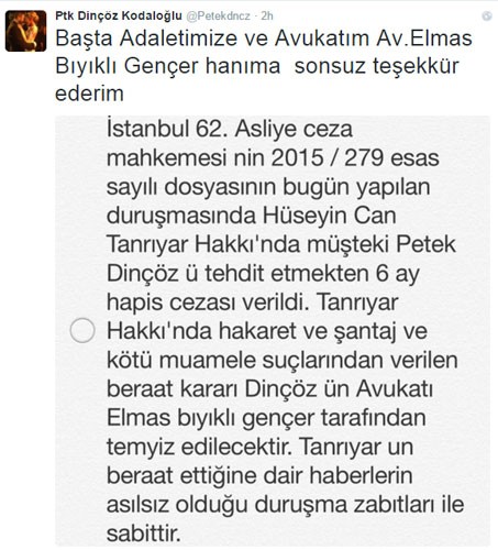 Petek Dinçöz Twitter hesabından dava sonucu paylaştı...