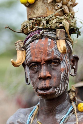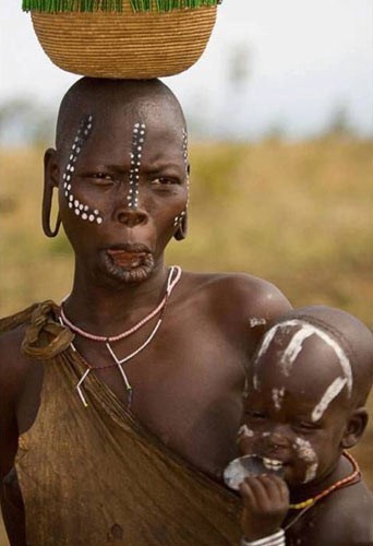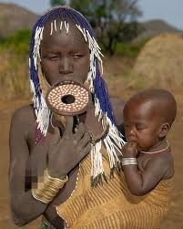 Etiyopya'da Mursi kadınları daha güzel görünmek için alt dudaklarını tutan kası küçükken kesiyor sonra tükürük birikmesin diye alt orta iki dişi çekiyor. Ve alt dudağa yıllar içinde gittikçe büyüyen tabaklar takıyor.
