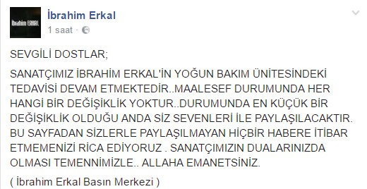 İbrahim Erkal'ın basın merkezinden yapılan açıklamada, sanatçının yoğun bakımdaki tedavisinin sürdüğü, sağlık durumunda herhangi bir değişiklik olmadığı belirtildi.