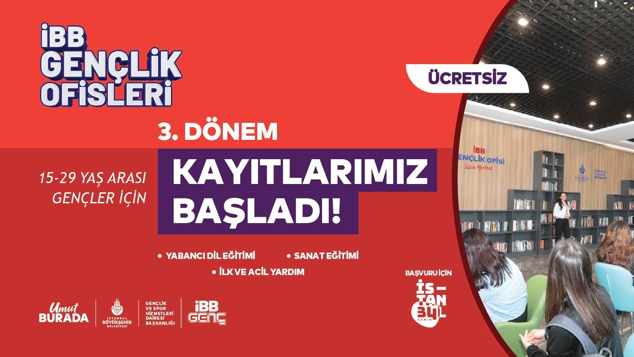 İstanbul Büyükşehir Belediyesi (İBB) tarafından 15-29 yaş arası gençlerin eğitim, kişisel gelişim ve kariyerlerini desteklemek amacıyla düzenlenen kurs ve seminerlerin gerçekleştirildiği İBB Gençlik Ofislerinde, 2025 yılı üçüncü dönem başvuruları başladı. Haftanın yedi günü hizmet veren Gençlik Ofislerinde üçüncü dönem eğitim programları 29 Eylül’de başlayacak. Ücretsiz olarak sunulan eğitimler, ekim, kasım ve aralık aylarını kapsayacak. 28 Aralık’ta tamamlanacak programlar, hem öğrenim hayatına devam eden hem de iş hayatına adım atmaya hazırlanan gençler için tasarlandı.