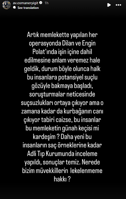 “Artık memlekette yapılan her operasyonda Dilan ve Engin Polat’ın da işin içine dahil edilmesine anlam veremez hale geldik. Durum böyle olunca halk bu insanlara potansiyel suçlu gözüyle bakmaya başladı.